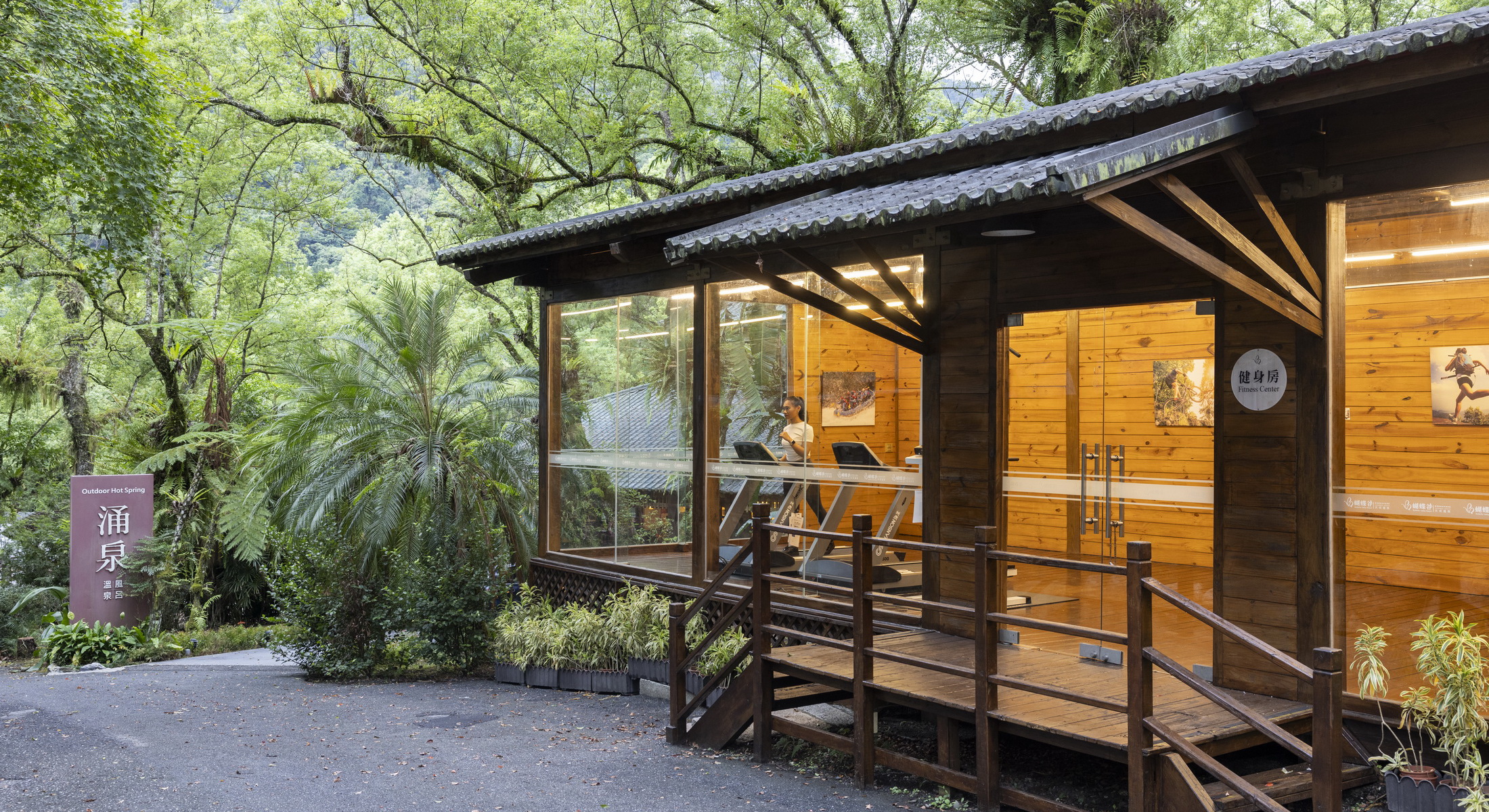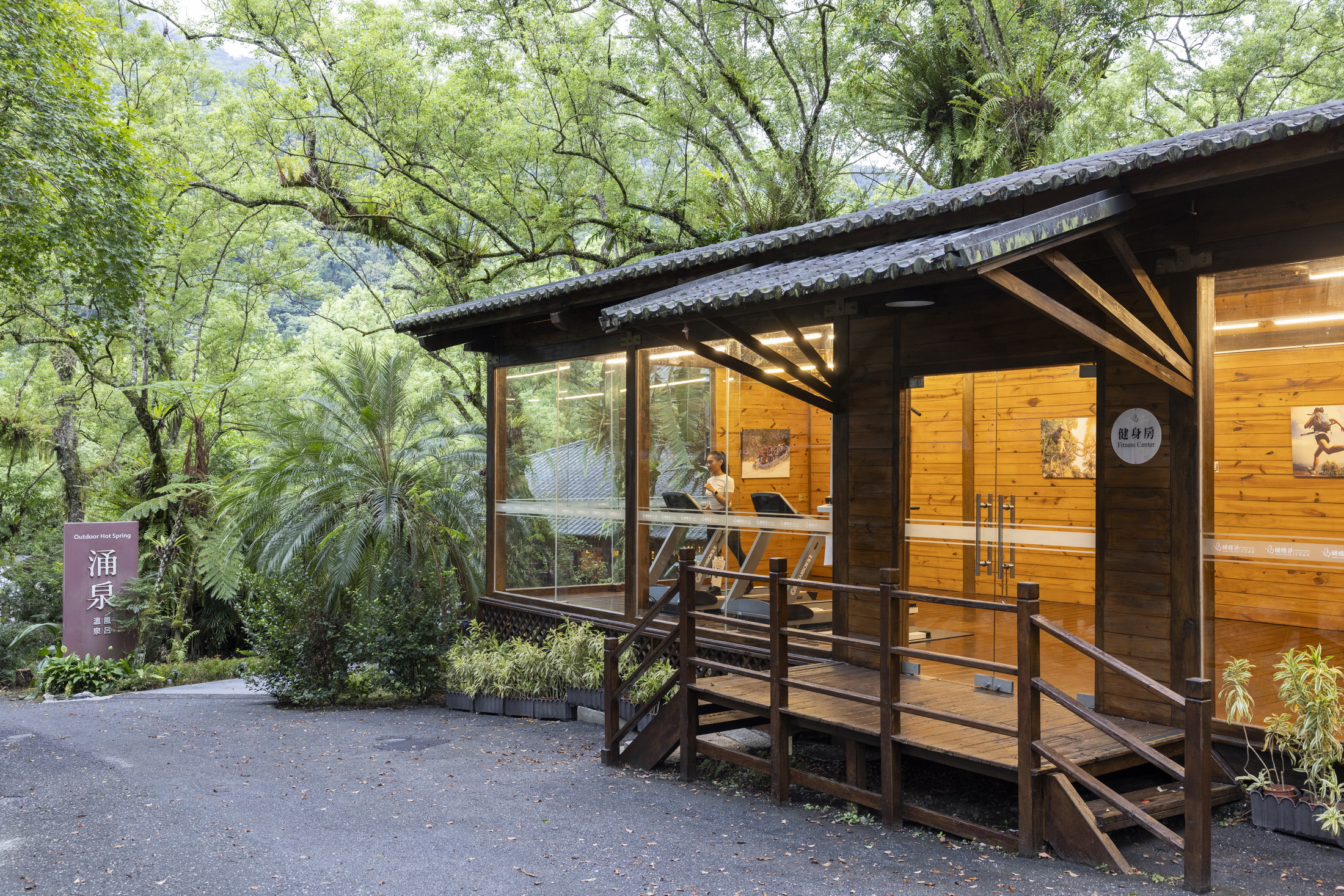 健身房坐落於森林環繞之中,大面落地窗設計引入陽光自然灑落,綠意盎然的景致盡收眼底。在光影與樹影相伴下,享受身心合一的運動時光。