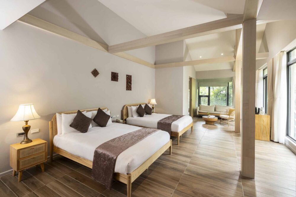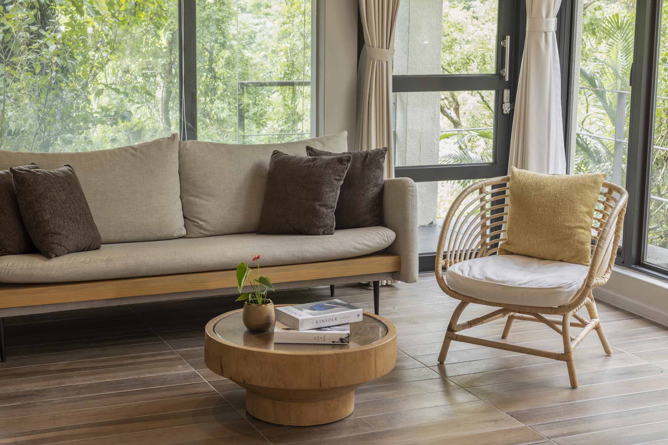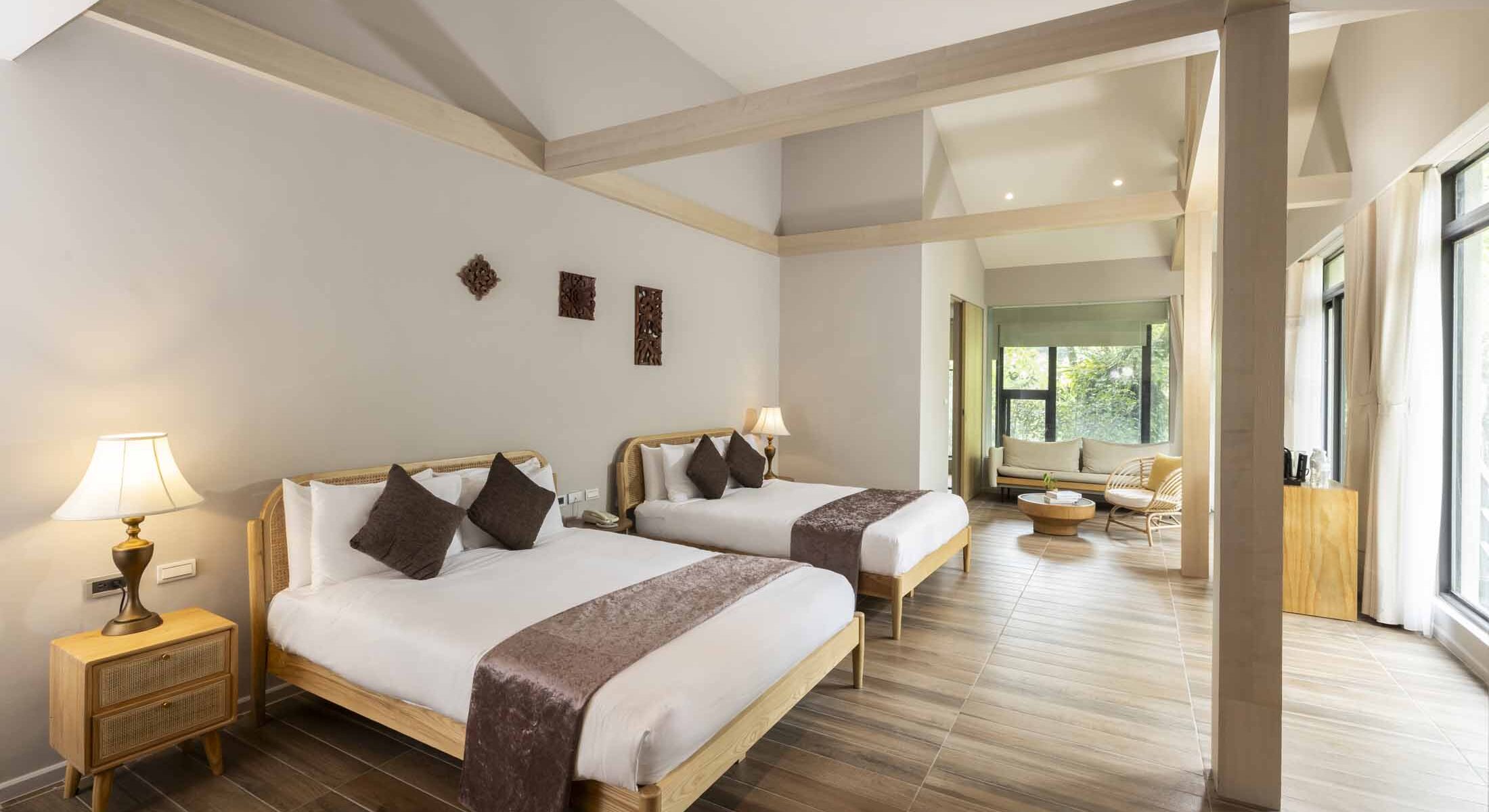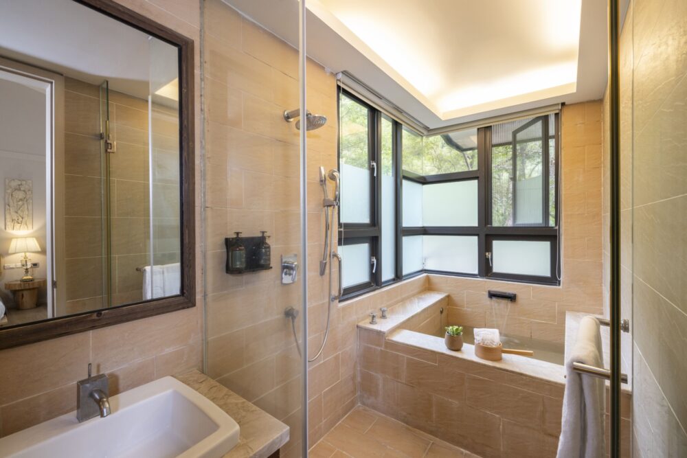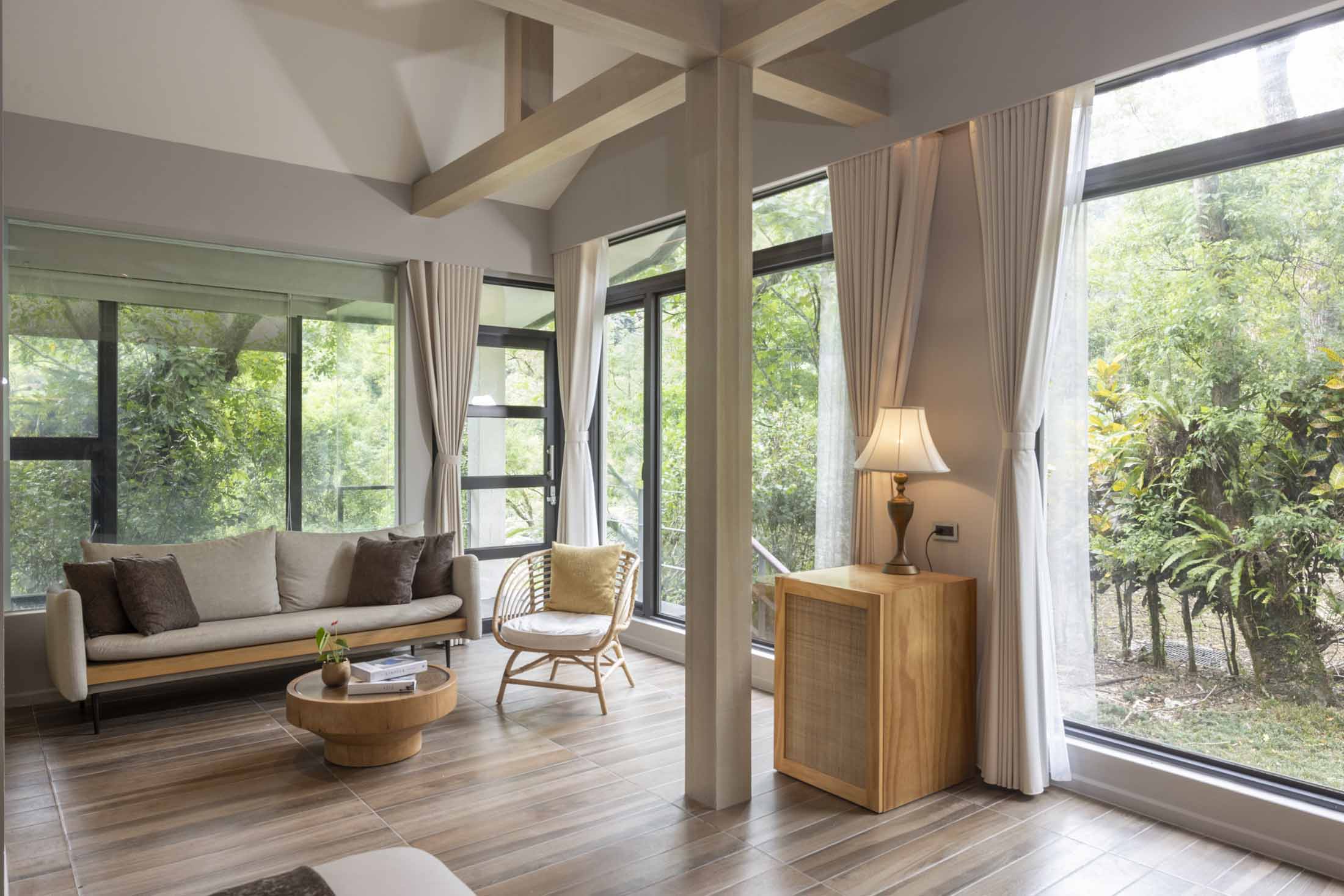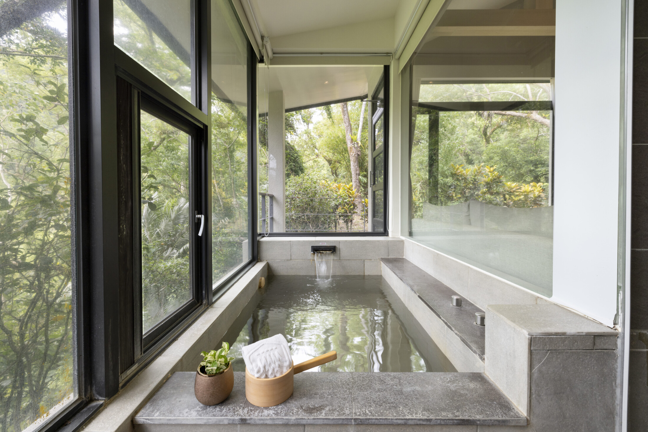 迎面而來的是整片透亮的落地窗與挺拔的樹柱,交織成一幅靜謐美景,層疊的綠意彷彿森林住進了房裡。浴室的獨立泡湯池緊鄰窗邊,泡進溫潤泉水時,遠山靜謐、林葉婆娑。戶外專屬陽台可倚坐靜觀山巒起伏,也能晨起伸展於林光之間,感受空氣中微微沁涼與草木香氣,在純粹自然裡重新甦醒。