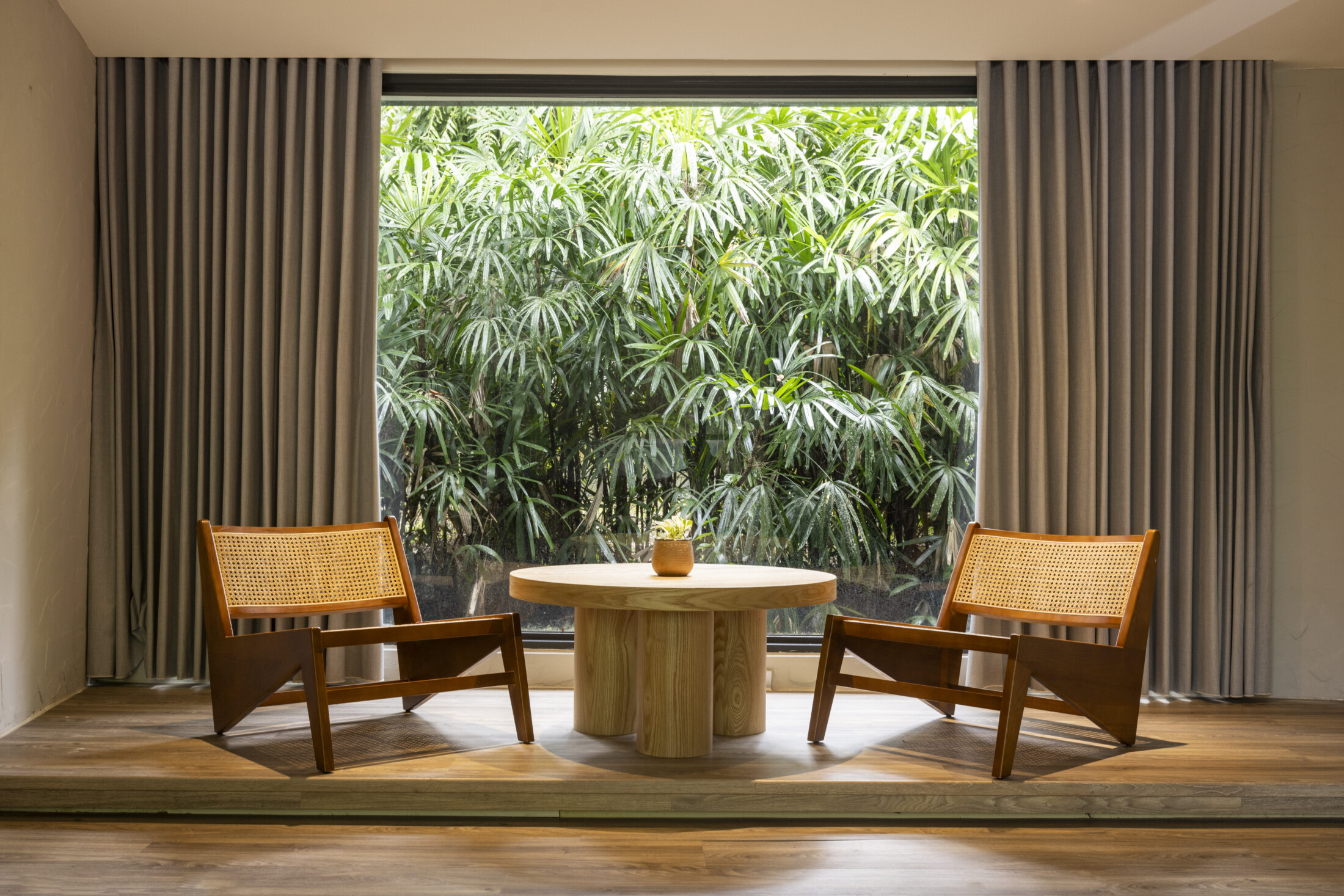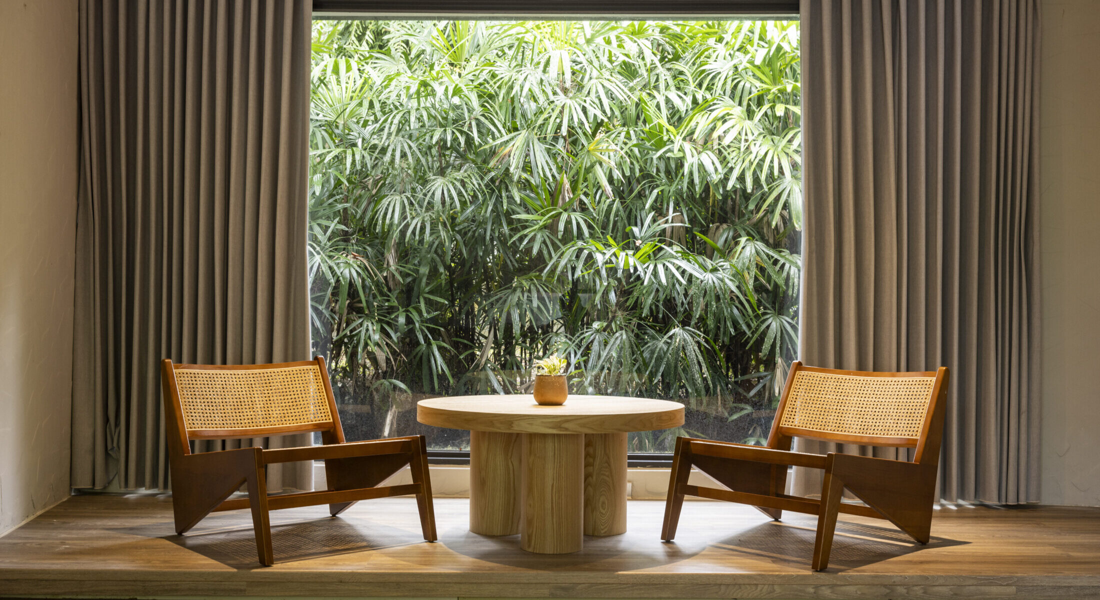 和風豪華客房以大片木質地板呈現純淨而柔和氛圍,落地窗景灑下森谷綠影,沉浸在窗邊的臥榻空間或寐或讀,或慵懶靜坐望山,讓心靈在山林氣息中緩緩沉澱。浴室內設有泡湯池,在溫暖湯泉的熱氣氤氳中釋放疲憊,讓身體隨著四野光影與微風靜靜流動,感受自然細語的輕柔擁抱。